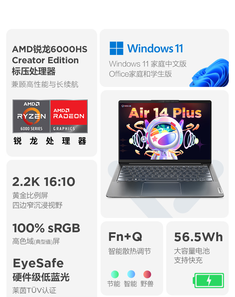 • 商品名称:【新品】联想小新Air14 Plus 2022标压锐龙版14英寸2.2K护眼屏 轻薄本笔记本电脑 学生网课学习商务办公