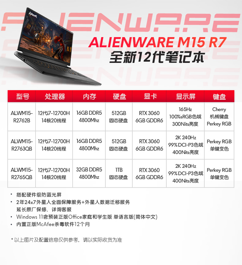 • 商品名称:【天猫V榜】ALIENWARE外星人m15 R7笔记本电脑15.6英寸12代英特热酷睿i7 RTX3060游戏本2K屏电竞玩家2022年新