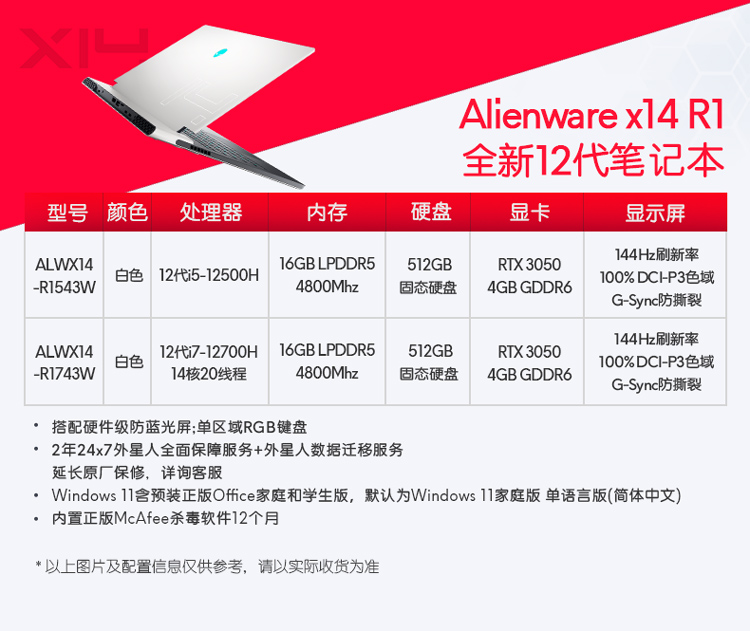 • 商品名称:【年度新品】ALIENWARE外星人x14轻薄高性能本14英寸游戏本高端笔记本电脑官方旗舰店设计本办公电竞新款学生