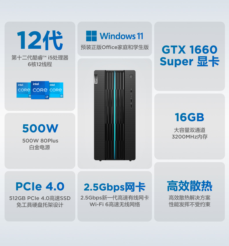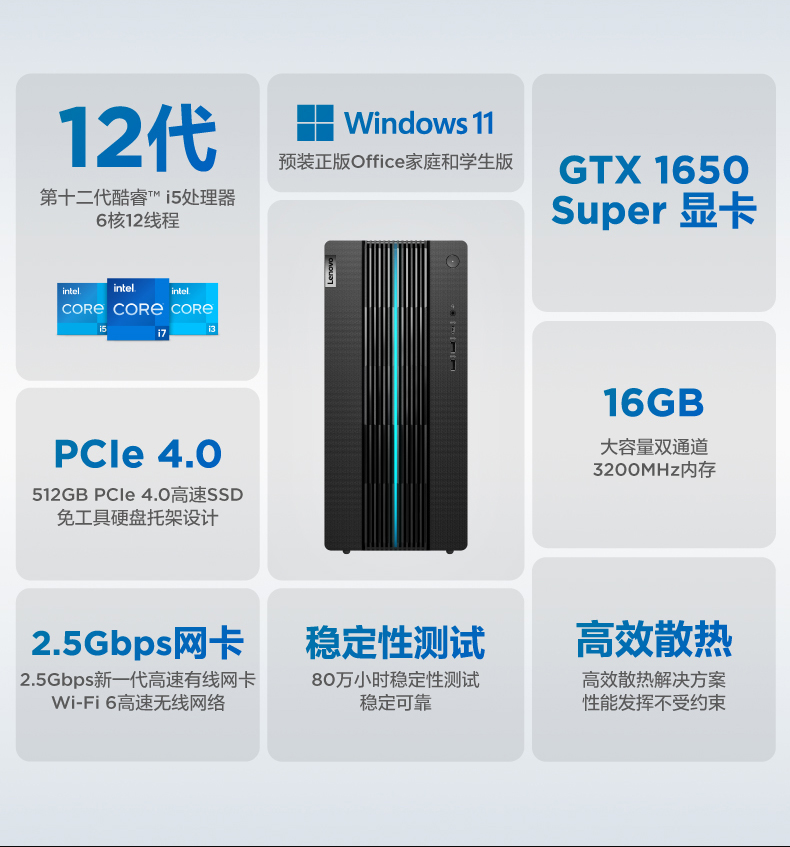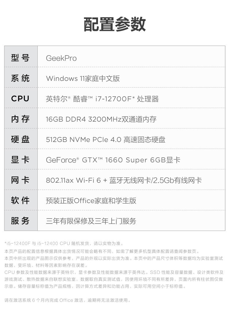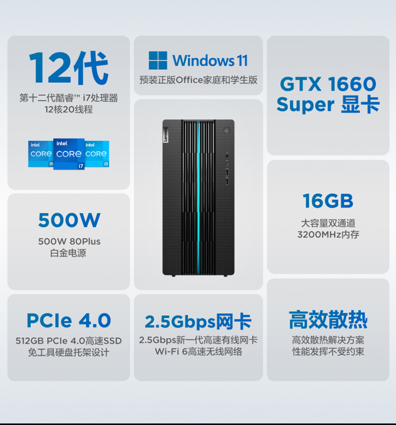 • 商品名称:【12代新品】联想GeekPro 2022 12代英特尔酷睿 Geek pro游戏设计师台式机电脑GTX1650S/1660S/RTX3060可选